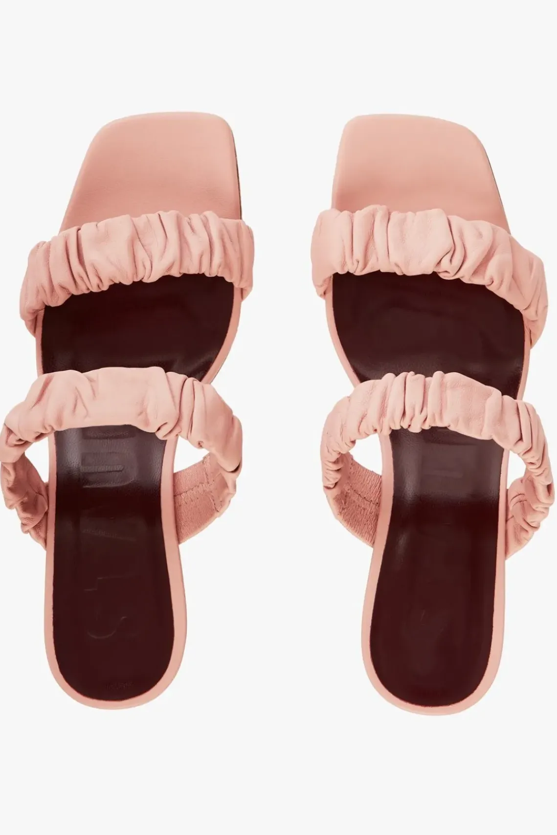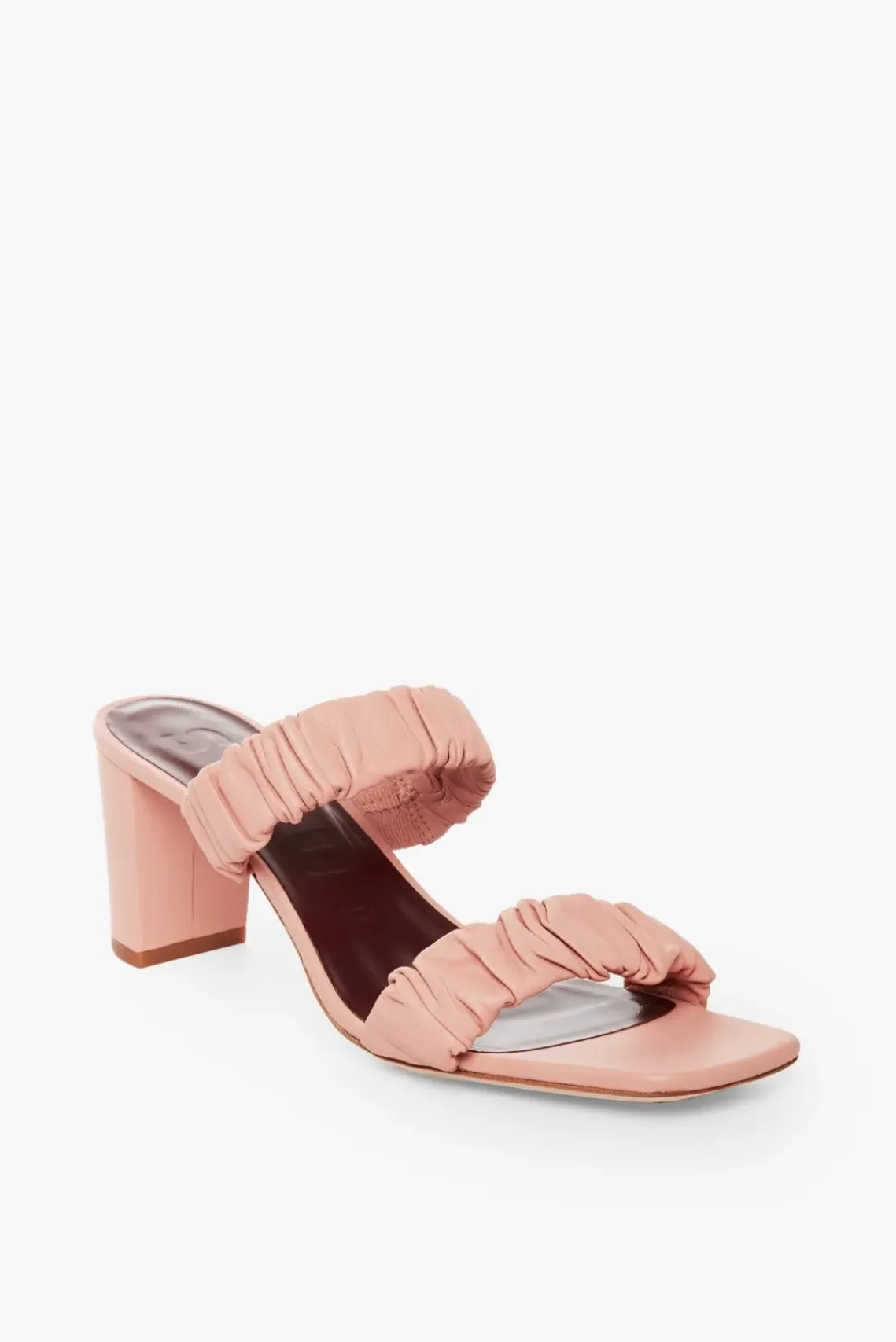 The soft ruched leather heel, the Frankie Ruched Sandal features an open square toe and mid heel.
