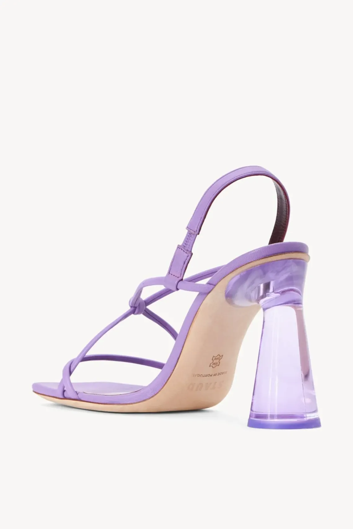 A knotted strappy sandal with elasticized slingback, The Leanne features a sculptural acrylic heel in matching tone.