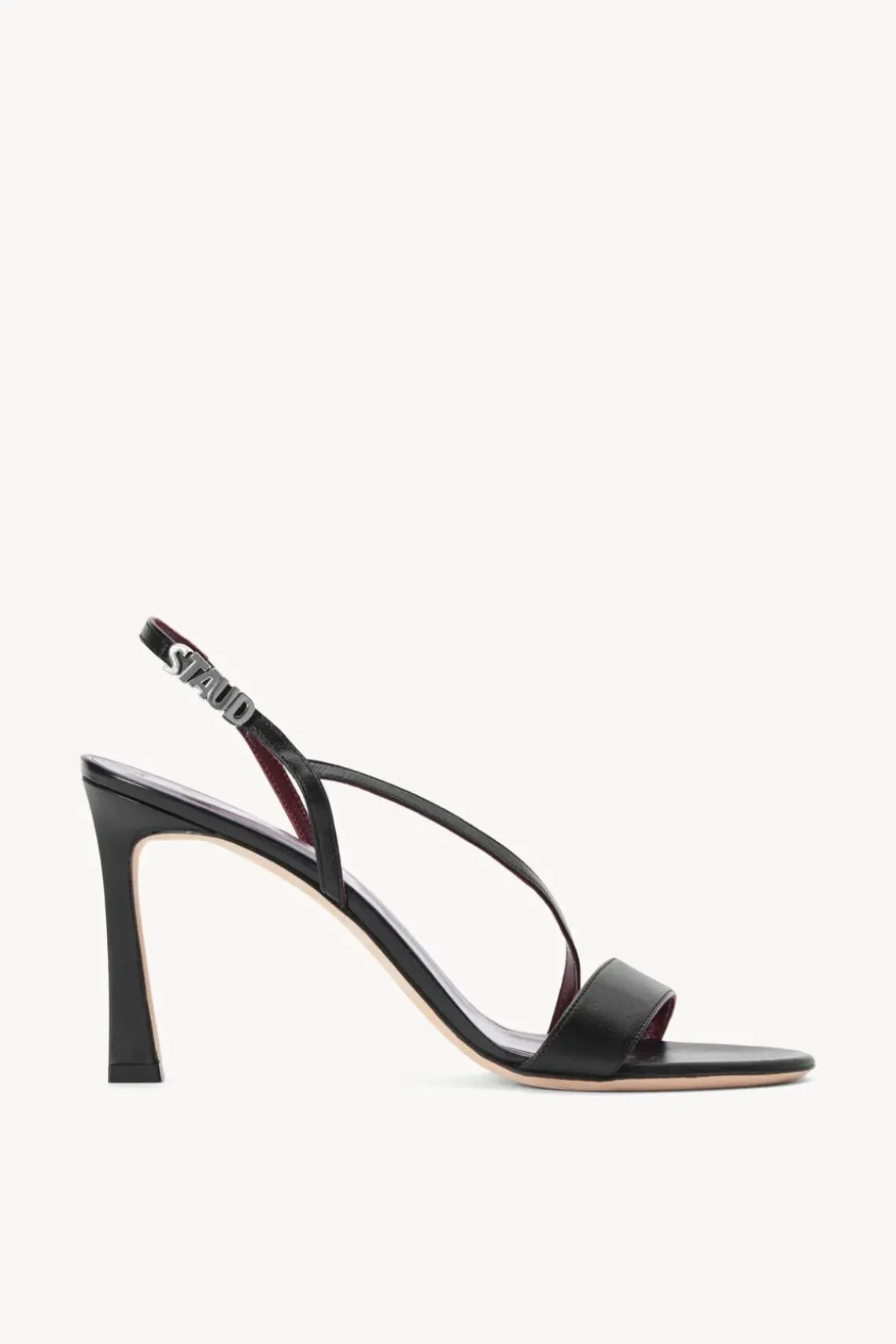 The Nadja Heel is an open toe leather slingback stiletto with a cross over strap and silver STAUD logo lettering detail at the ankle.