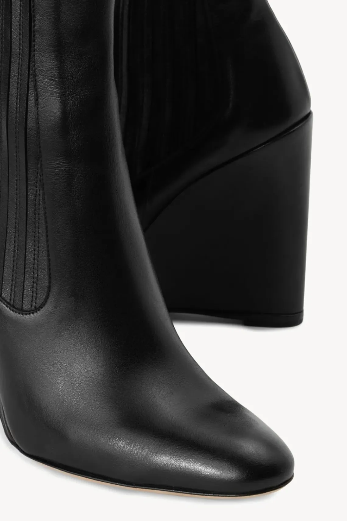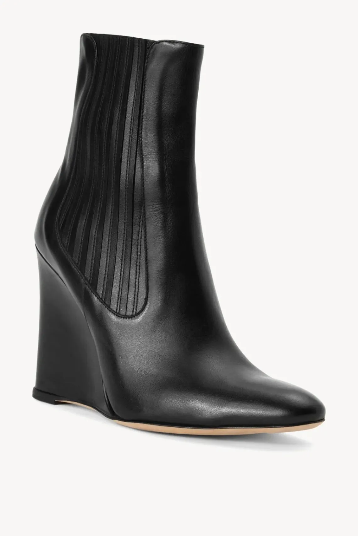 A high wedge boot with covered elastic panels, the Theo Ankle Boot features a rounded toe.
