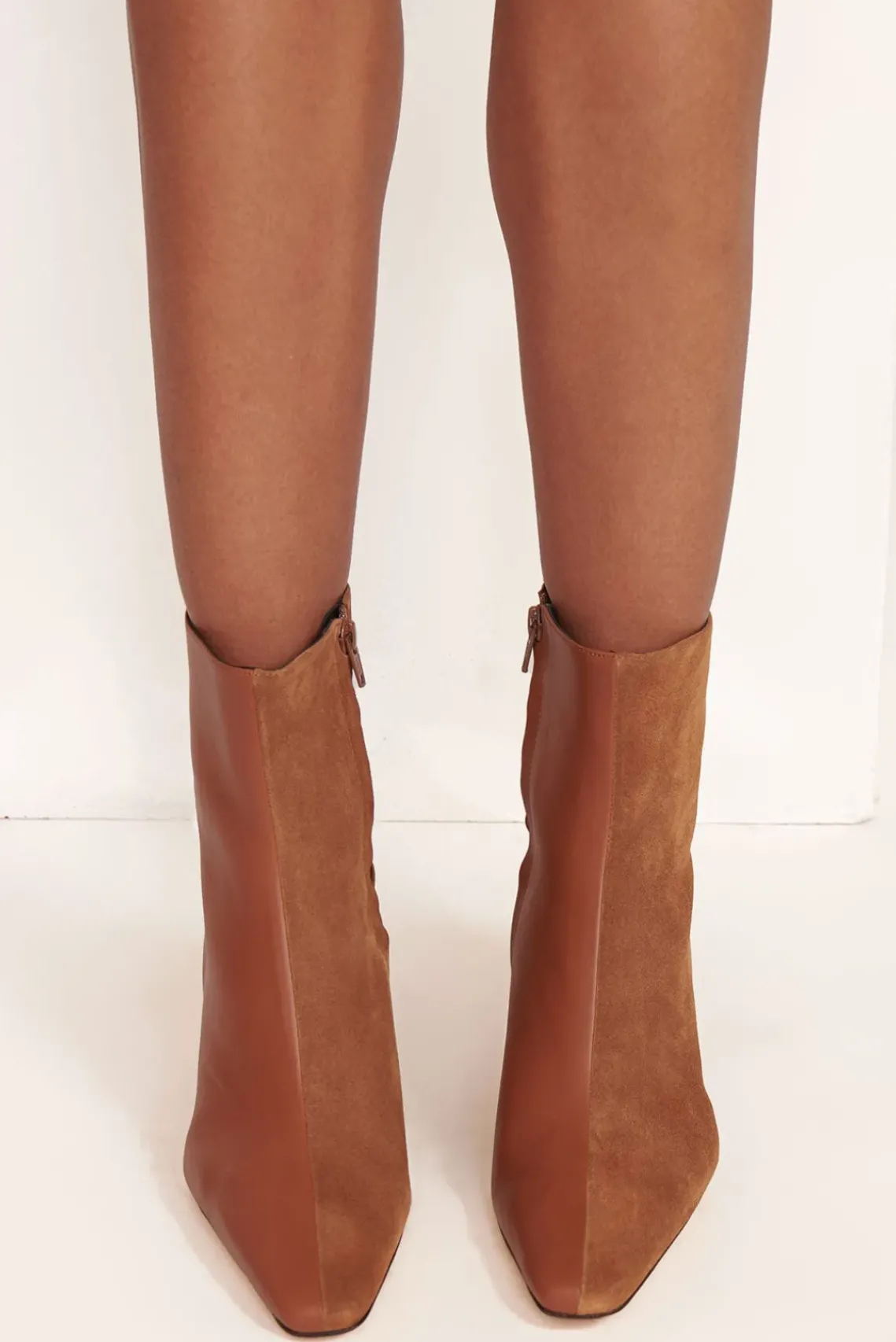 A seasonal update in mixed monochromatic leather and suede materials. The Wally Split Ankle Boot features a center seam, pointed rectangular toe, a blade heel and side zip closure.